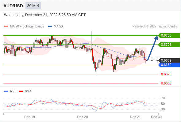 周三(12月21日)盘中,澳元/美元暂报0.6661,跌0.00118,跌幅0.27%。 澳元/美元汇率今日分析:在0.6650之上,看涨,目标价位为0.6705,然后为0.6730。在0.6650下,看空,目标价位定在0.6625,然后为0.6600。 技术点评:超短线(当日内)技术指标运行趋势复杂,应谨慎操作。