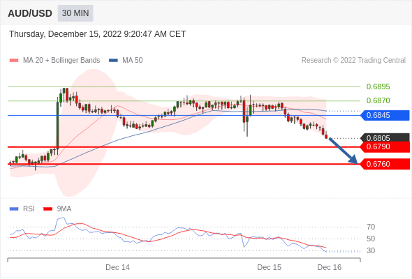 周四(12月15日)盘中,澳元/美元暂报0.6789,跌0.0074,跌幅1.06%。 澳元/美元汇率今日分析:在0.6845之下,看跌,目标价位为0.6790,然后为0.6760。在0.6845上,看涨,目标价位定在0.6870,然后为0.6895。 技术点评:RI技术指标向下运行。 阻力位:0.67