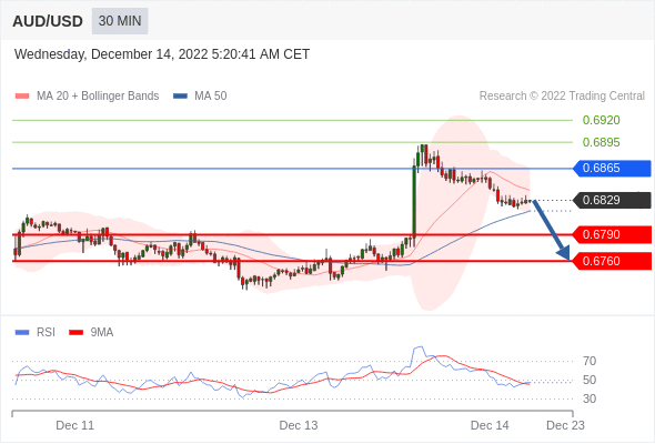 周三(12月14日)盘中,澳元/美元暂报0.6826,跌0.0028,跌幅0.41%。 澳元/美元汇率今日分析:在0.6865之下,看跌,目标价位为0.6790,然后为0.6760。在0.6865上,看涨,目标价位定在0.6895,然后为0.6920。 技术点评:只要依旧存在0.6865阻力位,价格波动存在看跌的趋势。 阻力位:0
