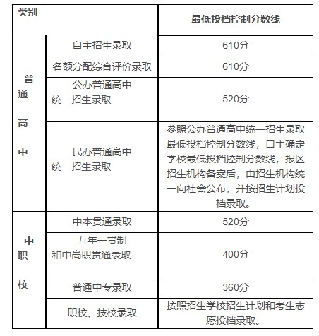 根据《上海市进一步推进高中阶段学校考试招生制度改革实施意见》(沪教委规〔2018〕3号),2022年本市全面实施高中阶段学校招生改革,招生录取包括自主招生录娶名额分配综合评价录取和统一招生录取三个批次。 经研究确定,2022年上海市高中阶段学校各类别招生最低投档控制分数线如下: