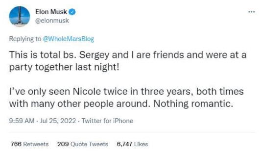 据《华尔街日报》7月24日消息,知情人士称,特斯拉CO马斯克去年秋天与谷歌联合创始人谢尔盖·布林的妻子妮可·沙纳汉发生短暂婚外情,这促使布林在今年早些时候提出离婚,两位科技亿万富豪的长期友谊也随之终结。马斯克在推特上针对相关报道称:“这完全是胡说八道。谢尔盖和我是朋友,我们昨晚还一起参加了一个聚会