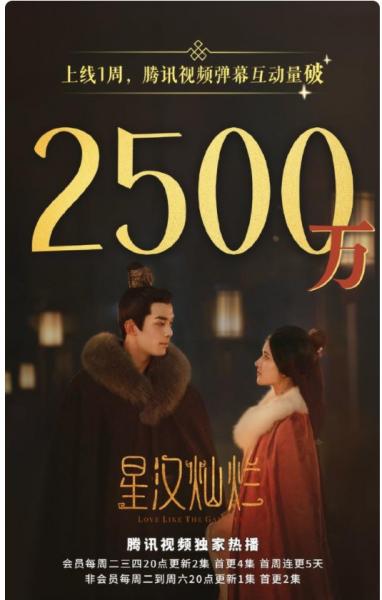 7月15日,腾讯电视剧在官方微博发布海报,庆祝《星汉灿烂》上线1周,腾讯视频弹幕互动量突破2500万。 古装家族群像剧《星汉灿烂》改编自关心则乱的小说《星汉灿烂,幸甚至哉》,由费振翔执导,吴磊、赵露思领衔主演,讲述了背负沉重身世的少年将军凌不疑(吴磊饰)与父母长期征战在外的“留守少女”程少