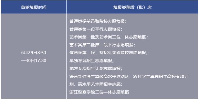 6月29日-30日,浙江省2022年高考首轮志愿填报展开。哪些考生可参与填报?需参考哪些重要资讯?一起来看。 6月29日8:30启动首轮填报 考生请及时登录浙江省教育考试院网站(www.zjz.t)填报,这是我省高考填报志愿的唯一网站。首轮填报的志愿类别见下表。 参考资讯集合 志愿怎么选怎