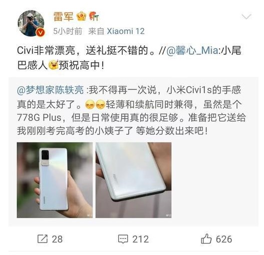 高考结束很多人都给自家孩子换了新手机,有网友晒出自己给家人买的新款小米Civi1,并表示轻薄和续航兼得,小米创始人雷军转发了这条微博,并配文:Civi非常漂亮,送礼挺不错的。据悉小米Civi1也是今年上半年刚发布的,主打轻薄和自拍。 从图片中可以看到,雷军换了新的微博头像,原来是一张自己的微笑