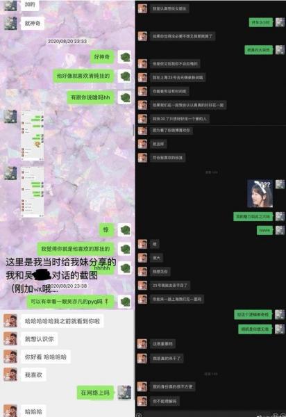 19日上午,吴亦凡及工作室刚刚辟谣,却又被一名女生站出来点名: 公开与吴亦凡的聊天对话,称大概在2020年8月跟男方加上好友,两人经过一段时间交谈后,男方频繁提出见面,并回答自己有时间谈恋爱,想认真地好好谈恋爱,同时追问女方是不是母胎单身、有没有发生过关系,坦言担心女方被骗。 张丹三