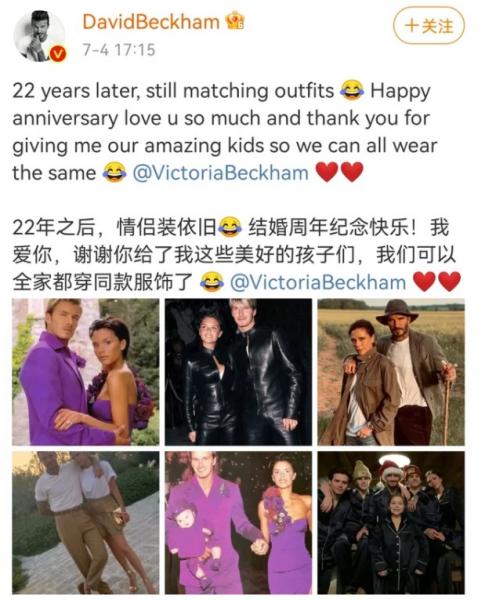 7月4号,贝克汉姆发文庆祝结婚22周年,表白妻子维多利亚“我爱你”,晒出大量夫妻合影,以及一家六口的全家福。他用了中英双语,对待中国粉丝很贴心。 这几张他和维多利亚穿情侣装的照片,有的高清有的模糊,拍摄时间明显不同。 他们曾穿着一身紫衣举行婚礼,连还是婴儿的大儿子都跟着搭配了紫色
