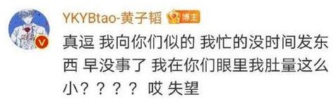 22日晚,黄子韬在微博为石玺彤专辑打call。因日前黄子韬发文对粉丝不满工作室一事表达失望,不少粉丝在评论区留言跟黄子韬道歉,他回应:“真逗,我像你们似的,我忙的没时间发东西,早没事了,我在你们眼里我肚量这么小????哎失望。” 早前,因粉丝不满活动造型、工作室拍图质量出图速度等,黄子韬发文表示所