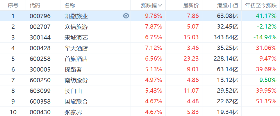 A股旅游股集体大涨,其中凯撒旅业一度涨停,众信旅游,华天酒店涨7%,宋城演艺,首旅酒店涨6%,探路者涨5%。 文化和旅游部昨日发布信息,综合各地文化和旅游部门、通讯运营商、线上旅行服务商数据,经文化和旅游部数据中心测算,10月1日至7日,全国国内旅游出游5.15亿人次,按可比口径同比减少1.5%,按