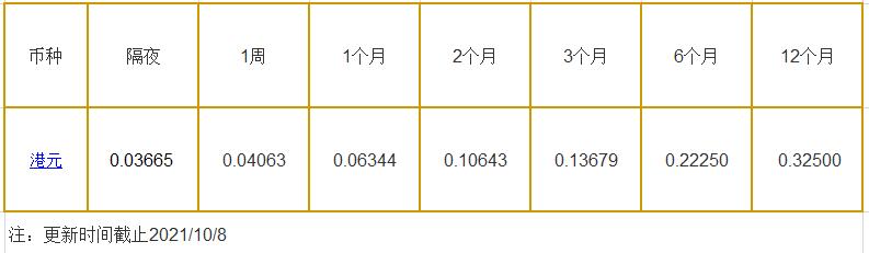 10月8日香港银行间同业拆借利率港币: 隔夜报0.03665%, 1周期报0.04063%, 1月期报0.06344%, 12月期报0.32500%。 香港银行同业拆放利率HIOR(HogkogItrakOffrdRat),指香港货币市场上,银行与银行之间的一年期以下的短期资金借贷利率,是从伦敦同业拆借利率(LIOR)