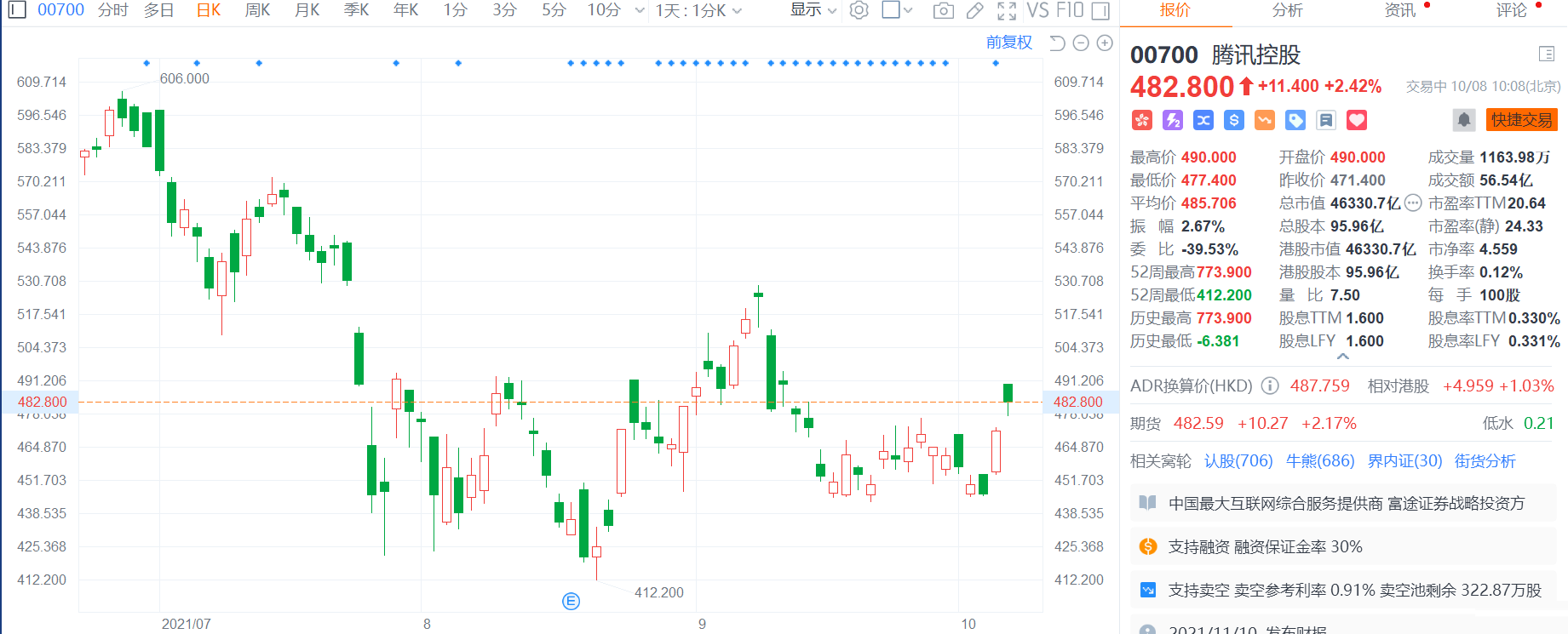 腾讯控股(0700.HK)今早高开近4%,高见490港元,现涨幅收窄至2.42%,总市值46331亿港元。 腾讯旗下重磅游戏《英雄联盟手游》公布,不删档测试将于10月8日上午10时正式开启,意味《英雄联盟手游》国服正式上线。腾讯此前宣布延迟推出《英雄联盟手游》,由原本9月15日延迟至国庆假期后。《英雄联盟手游》于