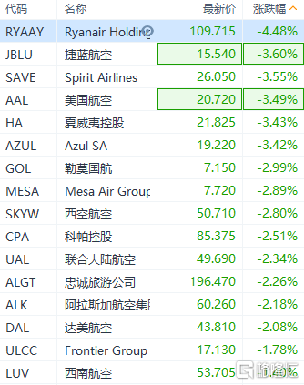 美股航空股普遍,捷蓝航空、美国航空、夏威夷控股跌逾3%。国际航空运输协会预测,全球航空业在2022年将继续亏损,但随着新冠疫情的恢复,预计明年全球航空业的亏损将比今年减少78%,至120亿美元。国际航协估计,2021年全球航空业的亏损为518亿美元,高于4月份预测的477亿美元。