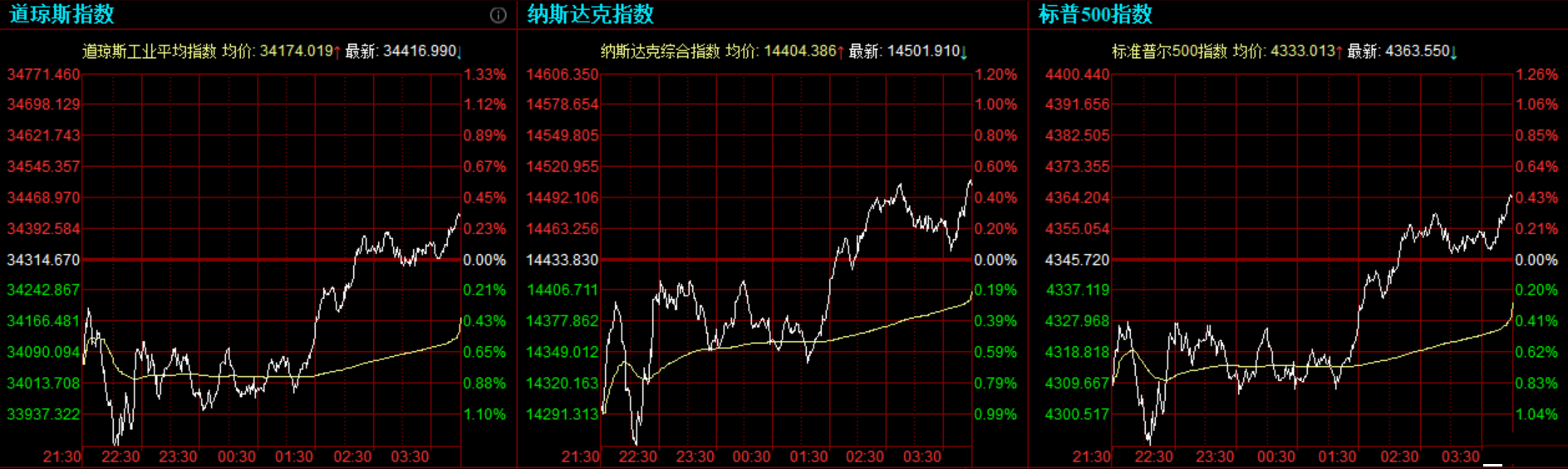 美国参议院共和党领袖米奇·麦康奈尔在推特发布声明,提出一项短期内提高美国债务上限的协议,有效期持续到11月末,上调额度将足够财政部应付到12月,以缓解迫在眉睫的违约风险。受此消息推动,美股三大股指尾盘悉数转涨。道指盘中一度下跌约450点,收盘涨102.32点,或0.30%,报34416.99点;纳指涨68.08点,或0.47%,