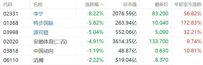 港股体育用品股跌幅继续扩大,李宁跌超8%,特步国际跌近7%,安踏跌超5%,波司登跌近5%。 浦银国际近日发布研报指,中国运动服饰行业近期股价偏软,主因市场未能预期近期运动服饰行业整体零售流水增速放缓。近期股价回调,有助于市埸对国内运动服饰品牌逐渐回归理性,重新调整今明两年零售流水增速的预期