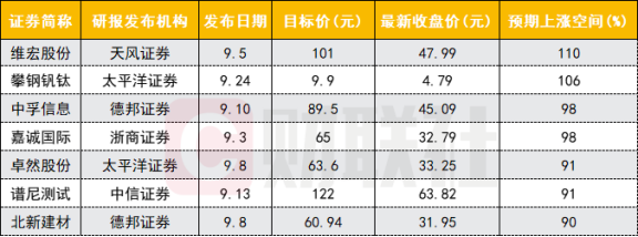 数据统计9月券商针对个股的首次覆盖研报,截至目前,预期上涨空间超过50%的有30只个股,其中天风证券首次覆盖的维宏股份、太平洋证券首次覆盖的攀钢钒钛预期上涨空间均超过100%,中孚信息、嘉诚国际、卓然股份、谱尼测试、北新建材这5只个股的预期上涨空间均超90%。(若券商给出的为目标价区间,按区间最高价计算空间