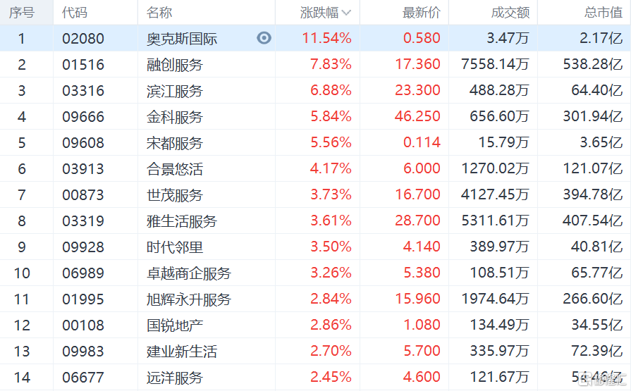 物管股逆势走强,融创服务大涨近8%,滨江服务涨近7%,金科服务涨约6%。 今日港股盘前,中国恒大和恒大物业宣布临时停牌,两家公司没有透露暂停交易的理由。合生创展亦宣布短暂停牌,以待刊有关主要交易的公告,合生创展拟同意收购一家在港交所上市之公司的股份,可能要根据香港收购及合并守则而对目标公