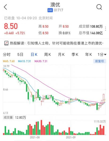 澳优(1717.HK)高开5.72%,报8.5港元,最新市值146亿港元。 据彭博援引知情人士称,针对可能收购在香港上市的婴儿配方奶粉生产商澳优一事,伊利一直在与银行讨论融资事宜,讨论还在进行,不确定是否会正式出价。针对此市场传言,伊利方面表示未收到相关消息。澳优相关人士表示,已留意到相关信息,公司信