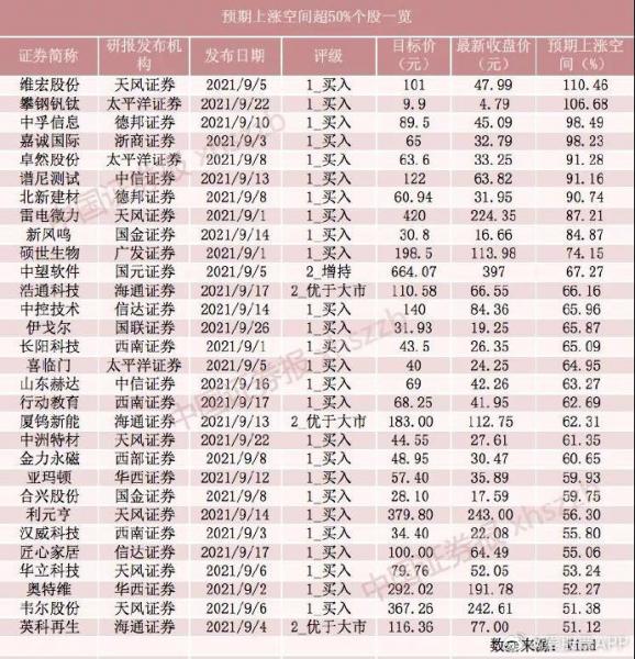 统计数据显示,9月份,券商出具了326份针对269只个股的首次覆盖研究报告。其中,剔除未明确目标价位的标的后,有30只个股最新价格距离目标价还有超过50%的上涨空间。截至目前,预期上涨空间超过50%的有30只个股,其中天风证券首次覆盖的维宏股份、太平洋证券首次覆盖的攀钢钒钛预期上涨空间均超过100%,中孚信息、嘉