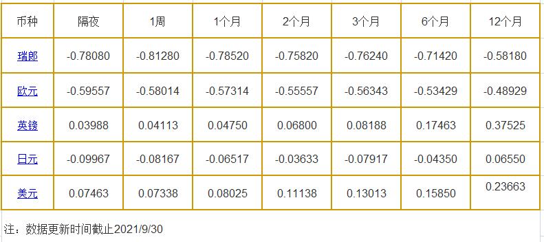 9月30日伦敦银行同业拆借利率: 隔夜LIOR:瑞郎报-0.78080%,欧元报-0.59557%,英镑报0.03988%,日元报-0.09967%,美元报0.07463%; 1周LIOR:瑞郎报-0.81280%,欧元报-0.58014%,英镑报0.04113%,日元报-0.08167%,美元报0.07338%; 1个月LIOR:瑞郎报-0.78520%,欧元报-0.57314%,英镑报0.047