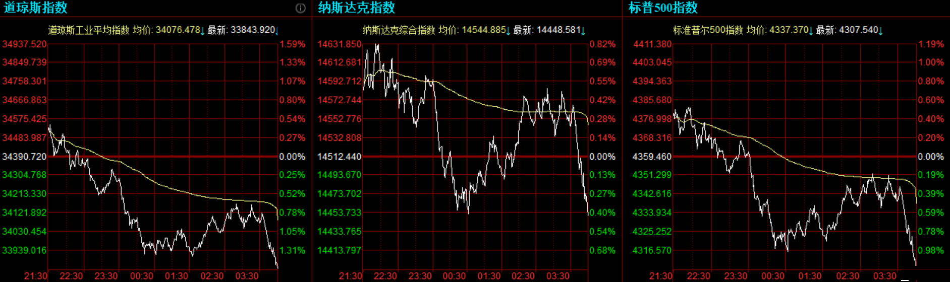 对通胀和供应链问题的担忧周四继续拖累市场,美股三大股指集体收跌,道指和标普500指数均跌超1%,科技股表现优于大盘,但纳指仍录得连续5个交易日下跌。 道指跌546.80点,或1.59%,报33843.92点;纳指跌63.86点,或0.44%,报14448.58点;标普500指数跌51.92点,或1.19%,报4307.54点。 整个9月美