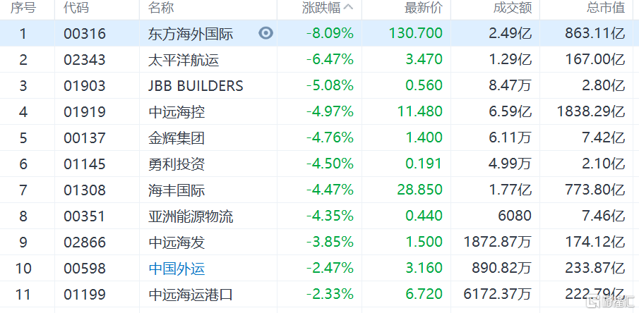 海运股下挫,东方海外国际大跌逾8%,太平洋航运跌6.47%,中远海控跌近5%。中国部分地区的工厂限电已经是板上钉钉的事实,很多出口工厂国庆节前都被限电,至于这轮限电持续到什么时候,尚不可知。但是可以确定的是,工厂限电,必然对部分外贸产品的产量造成影响,从而导致船运公司货量下降。 据中国经济