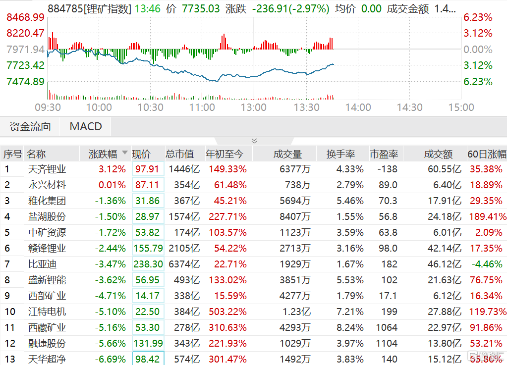 锂矿股午后短线拉升,板块指数跌幅收窄至3%以内,此前一度跌超6%。个股中,天齐锂业率先翻红,目前涨超3%,永兴材料翻红,盛新锂能、雅化集团等跌幅明显收窄。
