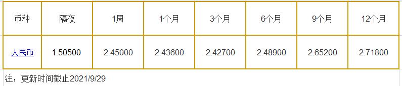 9月29日中国银行间同业拆借利率人民币: 隔夜报1.50500%, 1周期报2.45000%, 1月期报2.43600%, 12月期报2.71800%。 中国银行同业拆放利率(ChiaItrakOffrdRat,简称CHIOR)。同业拆借利率指金融机构同业之间的短期资金借贷利率。它有两个利率,拆进利率表示金融机构