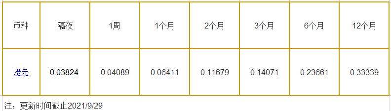 9月29日香港银行间同业拆借利率港币: 隔夜报0.03824%, 1周期报0.04089%, 1月期报0.06411%, 12月期报0.33339%。 香港银行同业拆放利率HIOR(HogkogItrakOffrdRat),指香港货币市场上,银行与银行之间的一年期以下的短期资金借贷利率,是从伦敦同业拆借利率(LIOR)