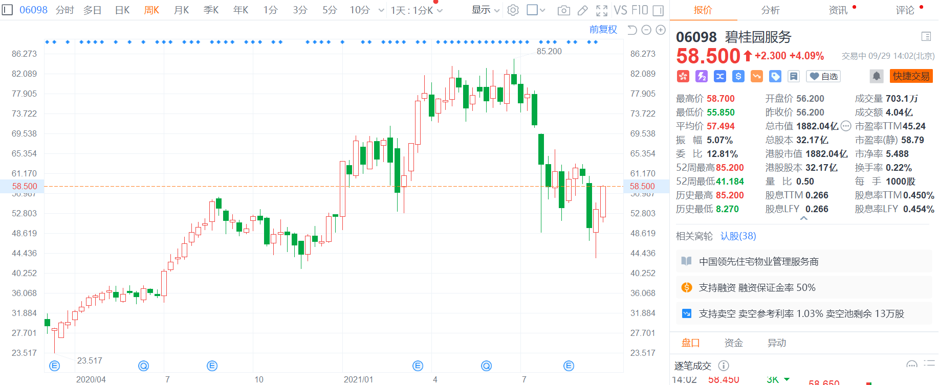 碧桂园服务(6098.HK)涨逾4%,报58.5港元,总市值1882亿港元。 碧桂园服务、宣布,于、9月28日,碧桂园物业香港(公司间接全资附属公司)与彩生活服务签订股权转让协议,据此,集团同意收购目标公司邻里乐控股的100%股权。总代价最高不高于人民币33亿元。就在一周之前,碧桂园服务刚刚斥资百亿收购了富力物