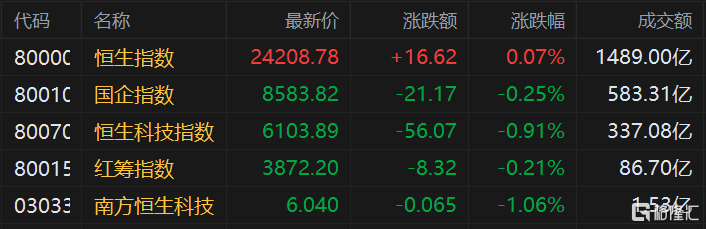 港股午后走弱,恒生科技指数一度跌超1.3%,收跌0.91%报6103点,恒指微涨0.07%报24208点,国指跌0.25%报8583点。 盘面上,集装箱现货运价连续第三周涨幅放缓,港口航运股大跌居前,中远海控下挫超14%;电力股、军工股高开低走,濠赌股、钢铁股、纸业股、教育股、体育用品股、内房股、汽车股纷纷下跌;烟