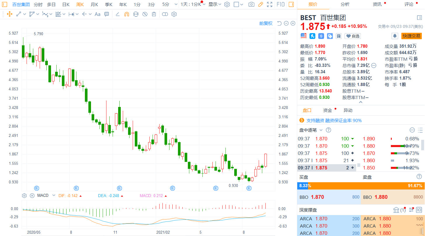 百世集团(T.U)今日股价高开高走,现涨幅扩大为10.95%,报1.875美元,暂成交644.62万美元,最新总市值为7.29亿美元。 知情人士消息称,百世集团考虑出售快递子公司,估值或至多达10亿美元。百世的股东包括阿里巴巴。公司表示对于市场传言不予置评。