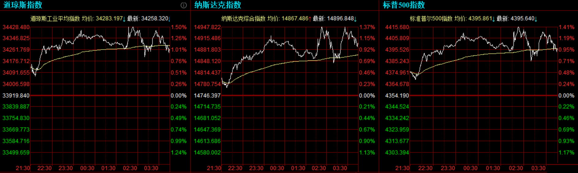 美联储维持利率决议不变,美联储决议声明宣布可能很快就会开始Tar,美股三大指数集体收涨。道指涨338.48点,或1%,报34258.32点;纳指涨150.45点,或1.02%,报14896.85点;标普500指数涨41.45点,或0.95%,报4395.64点。 美国科技龙头多数走强,苹果涨1.69%、特斯拉涨1.7%、亚马逊涨1.09%、谷歌涨0.93