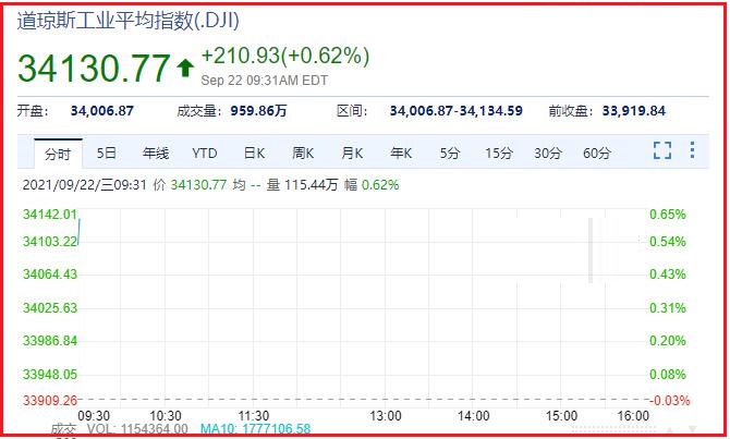 美股三大指数集体高开,纳指上涨0.37%,标普500指数涨0.48%,道指涨0.54%。铁矿石概念股走高,力拓涨超2%,必和必拓涨超1%。热门中概股多数上涨,百度、哔哩哔哩、京东涨超1%。联邦快递跌超7%,第一财季营收数据不及预期。 1、截止发稿时间,道琼斯报于:34141.86,成交量:1122.11万 2、美股快报