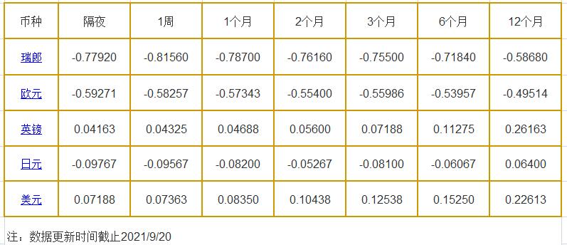 9月20日伦敦银行同业拆借利率: 隔夜LIOR:瑞郎报-0.77920%,欧元报-0.59271%,英镑报0.04163%,日元报-0.09767%,美元报0.07188%; 1周LIOR:瑞郎报-0.81560%,欧元报-0.58257%,英镑报0.04325%,日元报-0.09567%,美元报0.07363%; 1个月LIOR:瑞郎报-0.78700%,欧元报-0.57343%,英镑报0.046