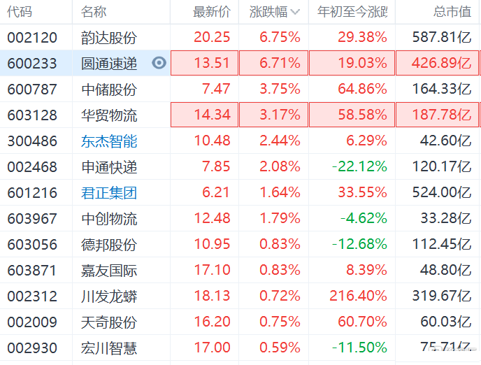 快递股走高,韵达股份、圆通速递涨超6%,中储股份、华贸物流涨超3%,申通快递涨超2%。 根据国家邮政局,8月全国快递服务企业业务量完成89.9亿件,同比增长24.3%。具体到各家快递公司,8月收入和单量都呈上升趋势。以收入从高到低来看,顺丰、韵达、圆通和申通8月快递业务收入分别为138.71亿元、31.28亿
