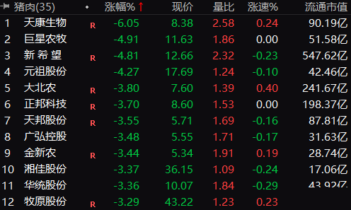 猪肉概念股全线下跌,天康生物跌6%,巨星农牧、新希望跌近5%,牧原股份跌超3%。 生猪期货主力合约再度走弱,盘中大跌逾4%,最低见13530元/吨,续创合约上市新低;现跌幅缩窄至3.5%。