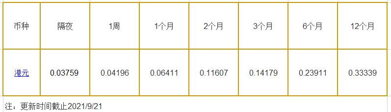 9月21日香港银行间同业拆借利率港币: 隔夜报0.03759%, 1周期报0.04196%, 1月期报0.06411%, 12月期报0.33339%。 香港银行同业拆放利率HIOR(HogkogItrakOffrdRat),指香港货币市场上,银行与银行之间的一年期以下的短期资金借贷利率,是从伦敦同业拆借利率(LIOR)