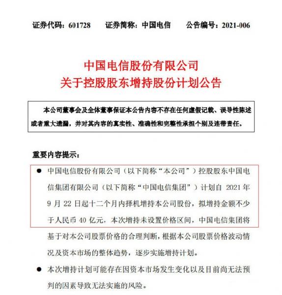 中国电信公告,公司控股股东中国电信集团有限公司(简称“中国电信集团”)计划自2021年9月22日起十二个月内择机增持本公司股份,拟增持金额不少于人民币40亿元,本次增持未设置价格区间,中国电信集团将基于对本公司股票价格的合理判断,根据本公司股票价格波动情况及资本市场的整体趋势,逐步实施增持计划。
