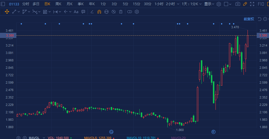 哈尔滨电气(1133.HK)续升近6%,3日累计涨幅达20%。盘中最高报3.47港元创逾2年新高价,总市值近60亿港元。 近期受惠国策扶持的风电及中资电力等设备股表现活跃,公司股价自8月中旬以来飙涨75%。此前中期业绩显示,公司归母净利润3447.1万元,同比增长18.19%。国泰君安称,公司已找到复苏之路,维持“收集