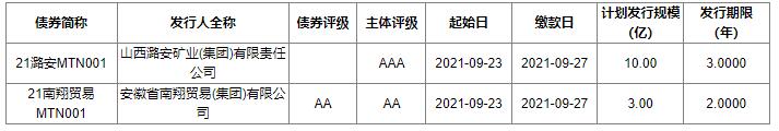 9月18日最新统计数据显示,近期中国债券市场将有2只中期票据发行,计划发行规模共计13.0亿元。其中即将在9月23日招标发行的“21潞安T001”计划发行金额10亿元,期限为3.00年,主体评级为AAA。具体情况如下: