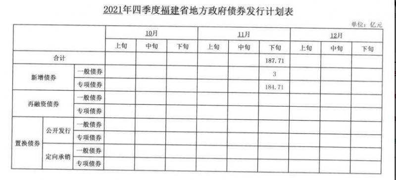 福建省财政厅公布2021年四季度福建省地方政府债券发行计划,将于11月下旬发行3亿元新增一般债和184.71亿元新增专项债。
