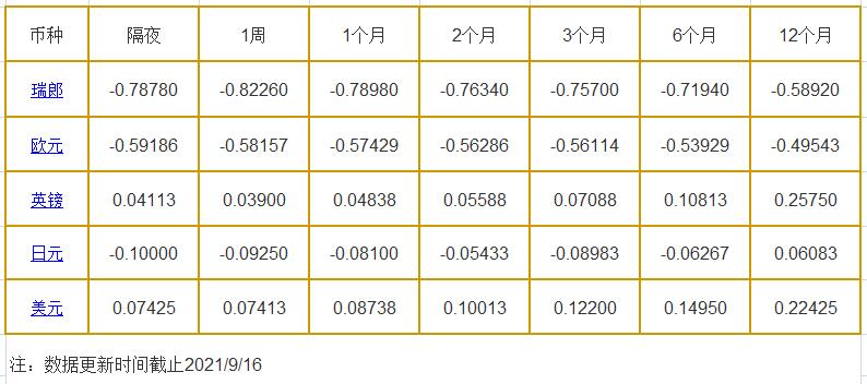 9月16日伦敦银行同业拆借利率: 隔夜LIOR:瑞郎报-0.78780%,欧元报-0.59186%,英镑报0.04113%,日元报-0.10000%,美元报0.07425%; 1周LIOR:瑞郎报-0.82260%,欧元报-0.58157%,英镑报0.03900%,日元报-0.09250%,美元报0.07413%; 1个月LIOR:瑞郎报-0.78980%,欧元报-0.57429%,英镑报0.048