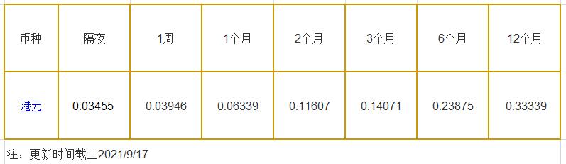 9月17日香港银行间同业拆借利率港币: 隔夜报0.03455%, 1周期报0.03946%, 1月期报0.06339%, 12月期报0.33339%。 香港银行同业拆放利率HIOR(HogkogItrakOffrdRat),指香港货币市场上,银行与银行之间的一年期以下的短期资金借贷利率,是从伦敦同业拆借利率(LIOR)