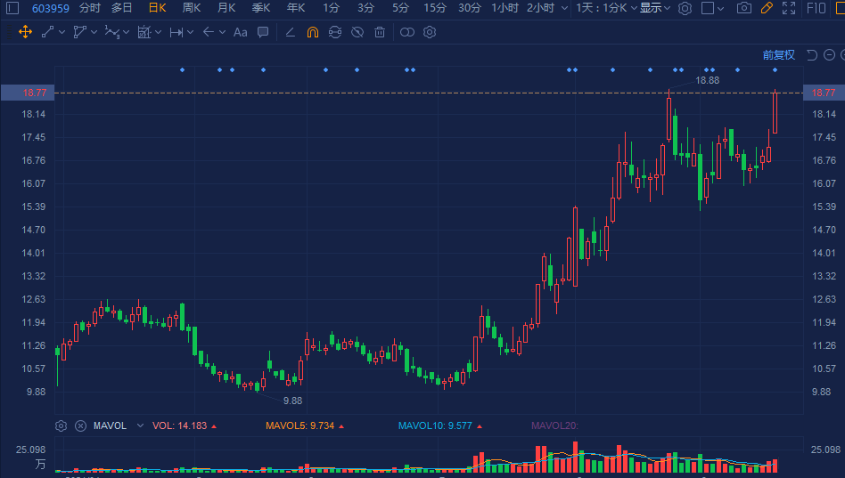 百利科技(603959.H)盘中涨停,现报18.84元突破近期高点,创2018年5月以来新高价,总市值超90亿元。 百利科技16日公告,控股股东拟合计转让公司11%股份,转让总价款为9.45亿元。另外,太平洋证券首予公司“增持”评级,该行称随着下游客户扩产的落地,公司锂电业务将保持高速增长。据悉,自2018年以来