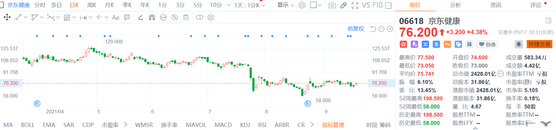 京东健康(6618.HK)股价高位盘整,现报76.2港元,涨幅4.38%,最新总市值2428亿港元。 中金研报指,药物零售及保健服务有助在数码健康链实现价值,相信公司建立基于生态圈的业务模式有强劲盈利潜力。估算今年收入达276亿元人民币,明年进一步增加至388亿元。首予京东健康跑赢行业评级,目标价102.4港元。