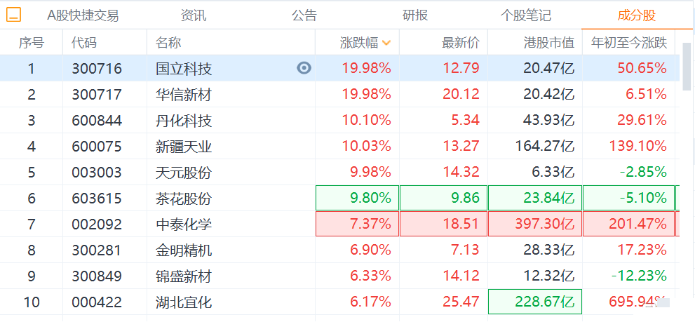 指数早盘震荡走弱,创业板指一度跌近2%,养殖业、食品加工、白酒等大消费板块明显升温,煤炭、钢铁等周期股冲高回落,光伏建筑、锂电池遭重挫,汽车整车板块较萎靡,两市个股跌多涨少,炸板率高,赚钱效应较弱。 盘面上,煤化工板块持续走高,华信新材涨停,丹化科技、宝丰能源、远兴能源跟涨;乳业板块持续拉