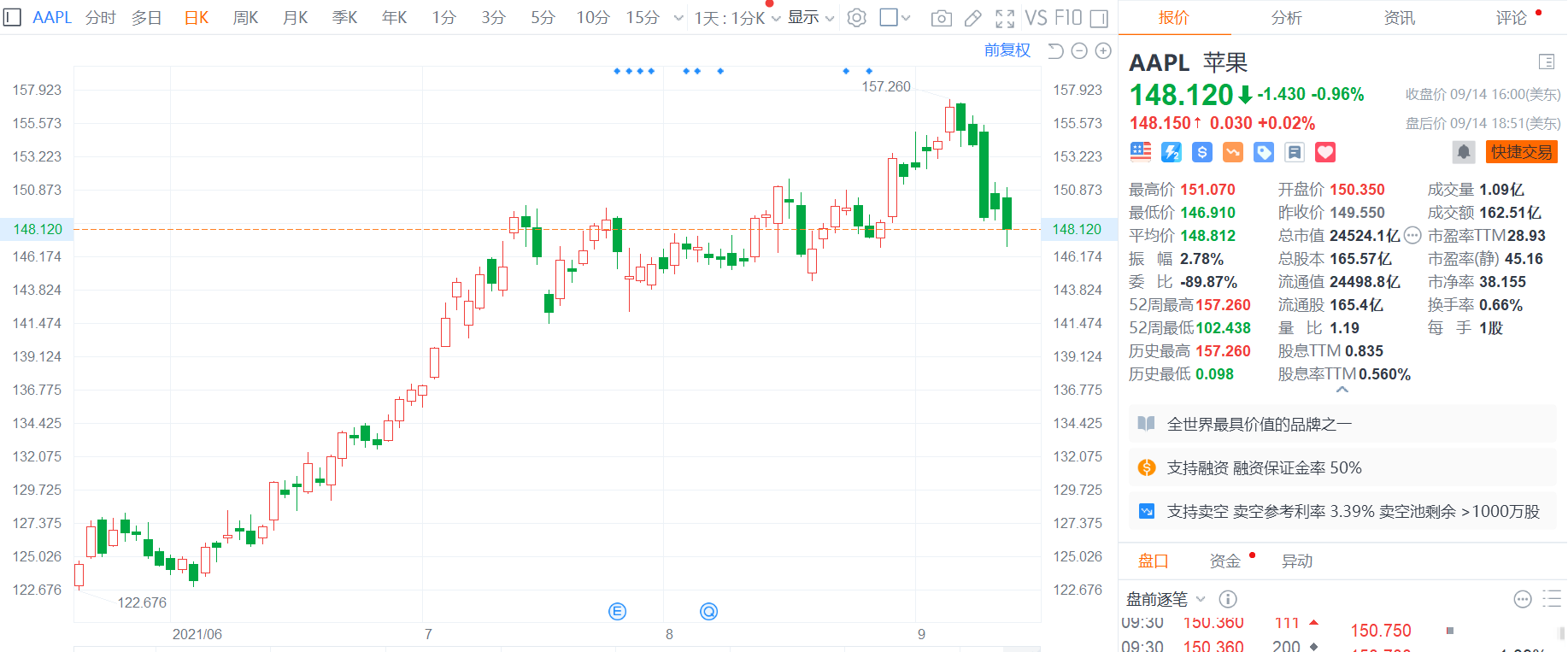 苹果(AAL.U)周二收盘下跌0.96%,报148.12美元,盘中一度跌逾1.5%,最新市值逾2.4万亿美元。 苹果公司秋季发布会于北京时间15日凌晨1点召开,刘海变小的iho13系列手机、没有变“方”的AlWatchri7、支持5G的iadii等产品悉数亮相,但发布会并未提及此前外界期待的新款Airod无线蓝牙耳机或