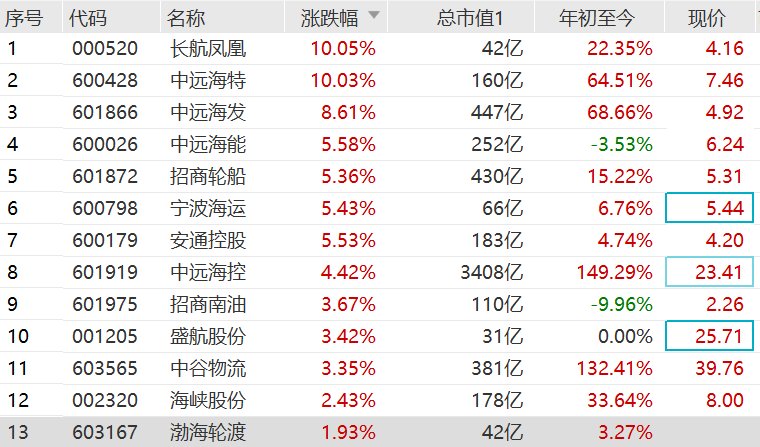 航运巨头宣布暂停运费上涨,带头稳预期,港A两地海运股集体拉升。A股长航凤凰和中远海特涨停,中远海发、中远海能、中远海控、招商轮船、宁波海运等跟涨。港股中远海发涨超4%,中远海控、中远海能等跟涨。 海运旺季之时,中美海运价格重返2万美元/FU(40英尺标准集装箱)以上。截至12日,中国/东南