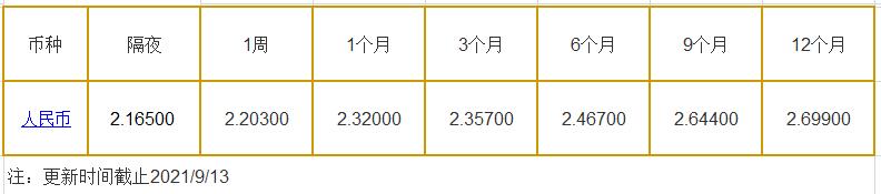 9月13日中国银行间同业拆借利率人民币: 隔夜报2.16500%, 1周期报2.20300%, 1月期报2.32000%, 12月期报2.69900%。 中国银行同业拆放利率(ChiaItrakOffrdRat,简称CHIOR)。同业拆借利率指金融机构同业之间的短期资金借贷利率。它有两个利率,拆进利率表示金融机构