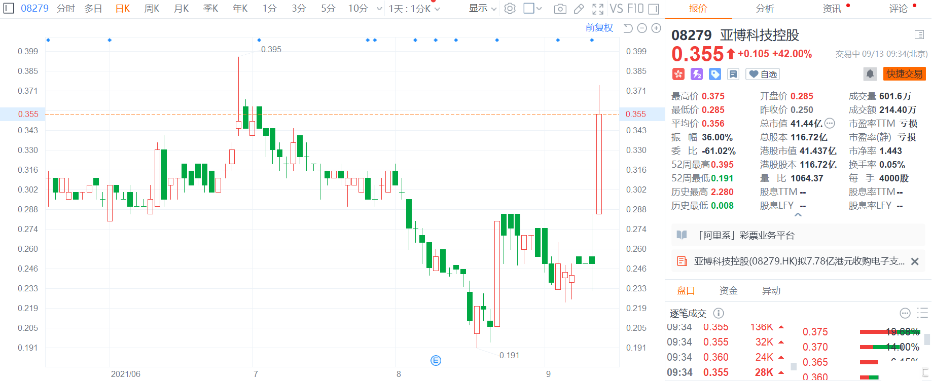亚博科技控股(8279.HK)高开高走,现大涨42%,报0.355港元,总市值41亿港元。 亚博科技控股公布,于2021年9月10日,公司、该等买方(均为公司间接全资附属公司)、该等卖方与目标集团已订立该协议,据此,该等卖方有条件同意出售,而该等买方有条件同意收购目标公司的全部股权及澳门通的1%股权(其99%股权由
