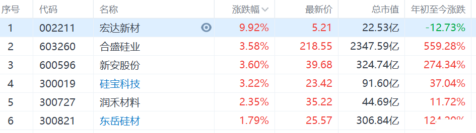 有机硅概念股走强,宏达新材涨停,合盛硅业和硅宝科技等涨超3%。 9月9日,有机硅DC(二甲基环硅氧烷混合物)国内市场报价3.77万元/吨,与去年同期相比已翻倍,今年以来涨幅超70%,创下2011年9月以来的新高。因环保等原因,有机硅新增产能受限,致使供给出现缺口。此外,上游工业硅产能受云南限电影响,